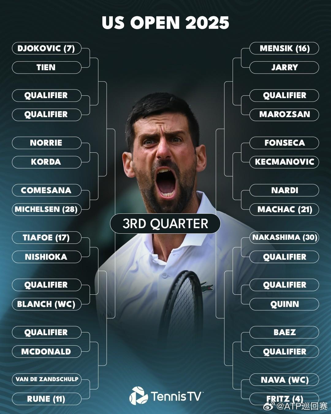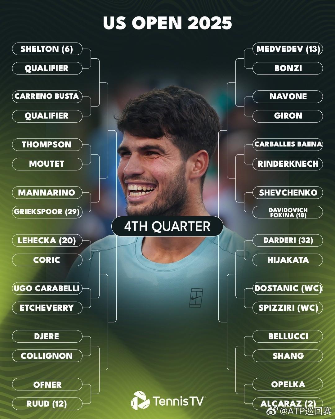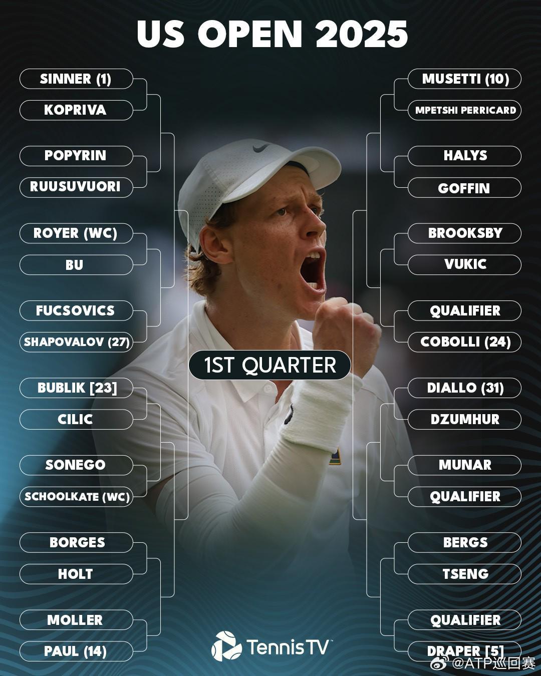 男单方面,1号种子辛纳和2号种子阿尔卡拉斯首轮将分别面对科普利瓦和奥佩尔卡,德约作为7号种子出战,首轮面对本土新星勒纳-钱。